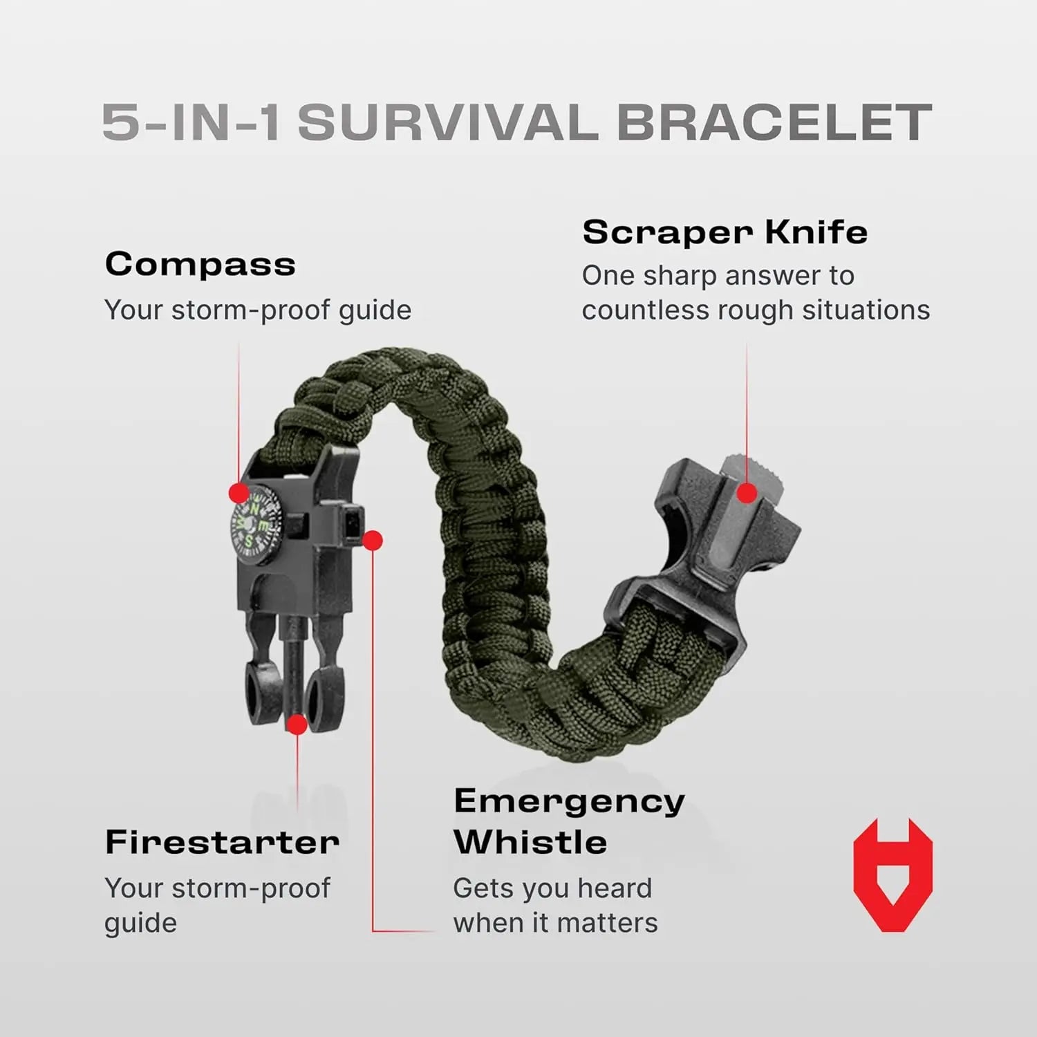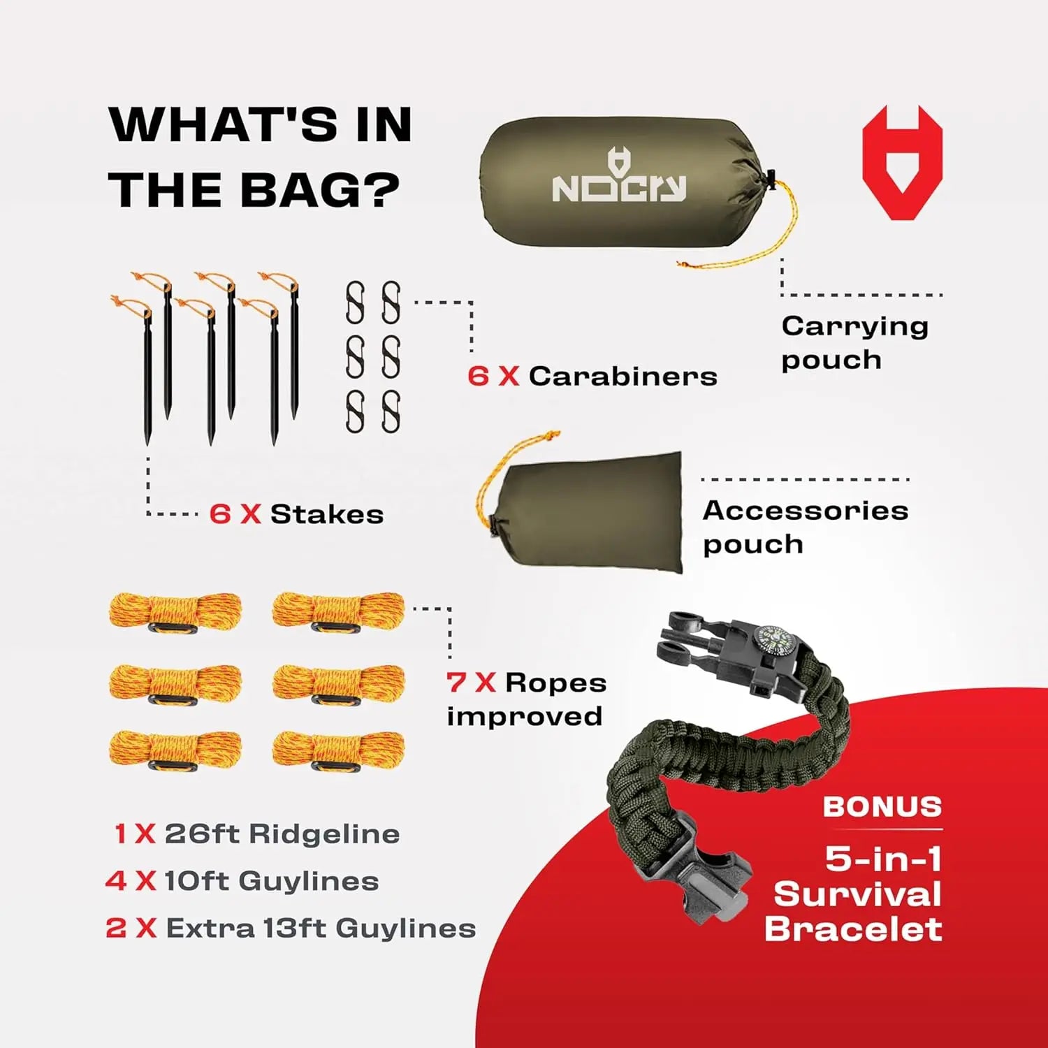 4. Comprehensive Gear Kit Included: Each purchase comes with everything needed for setup: one rainfly tarp, six aluminum stakes with orange reflective paracord ties, six carabiners, seven adjustable ropes, one sack for storing ropes and poles, and one carrying pouch to keep all components organized. As an added bonus, a survival bracelet is included to enhance your outdoor preparedness.