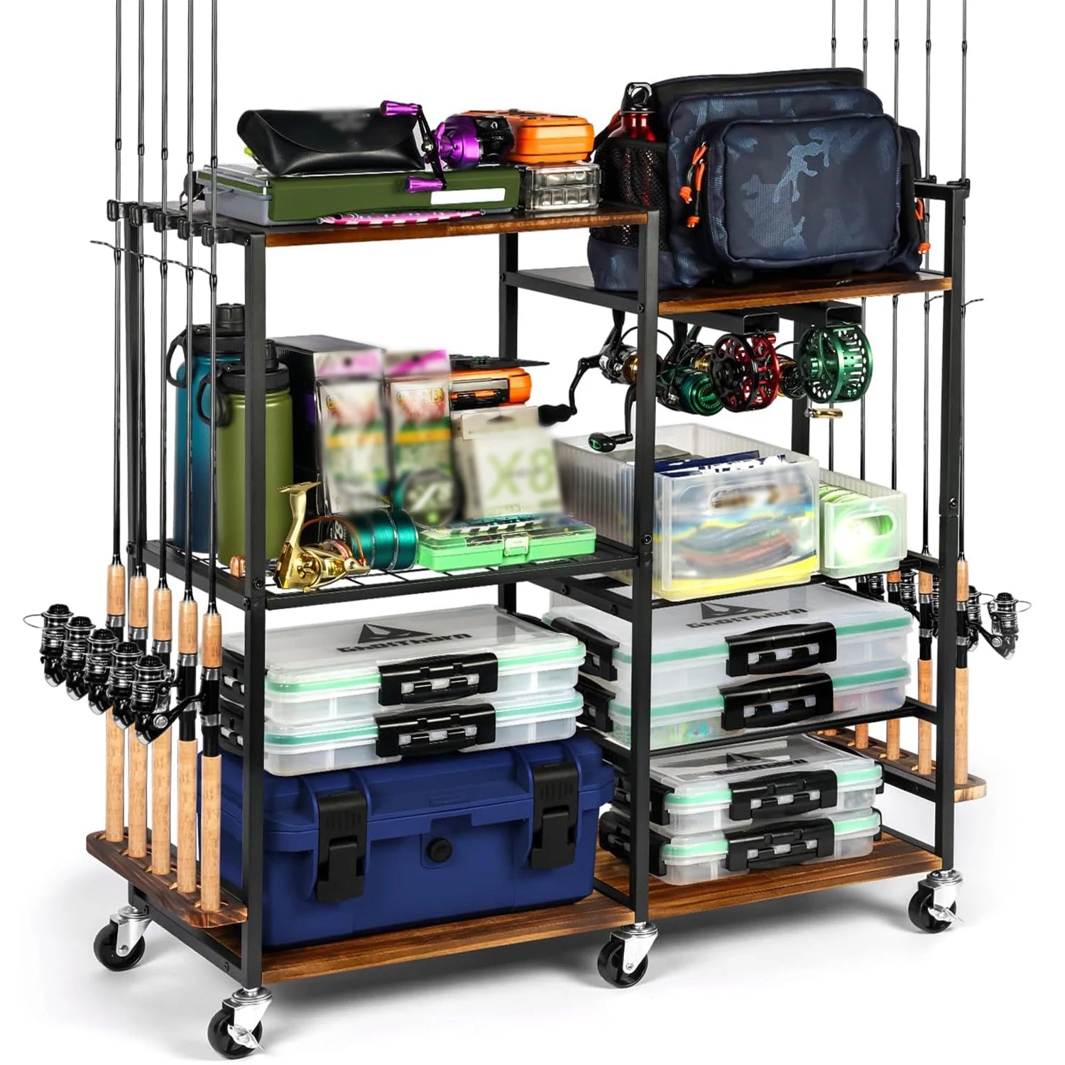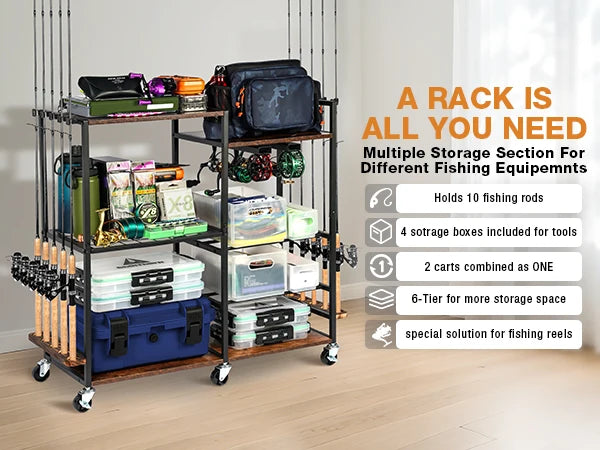 Garage Fishing Pole Rack Containers Included, up to 10 Rods Tackle Box Reel Storage Fishing Rod Rack